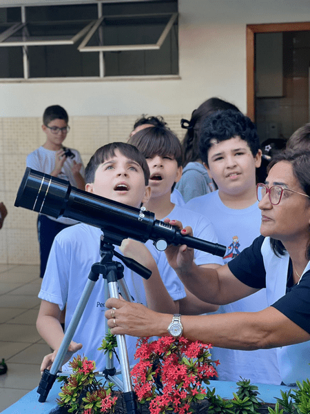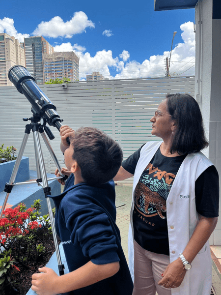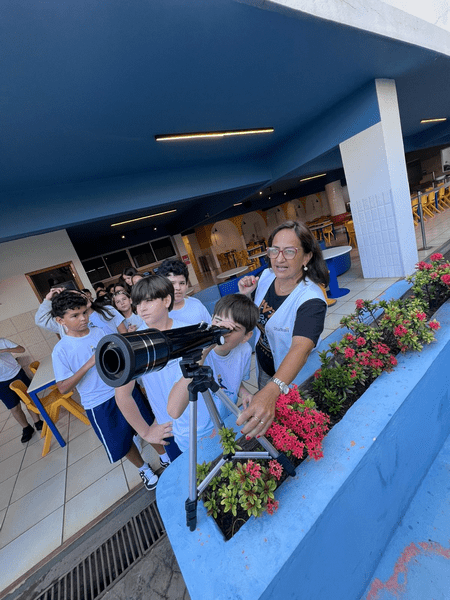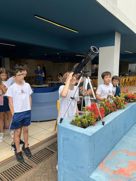 Na aula prática de astronomia, os alunos do 5º ano exploraram o universo pelo telescópio, despertando curiosidade, encantamento e pensamento científico.