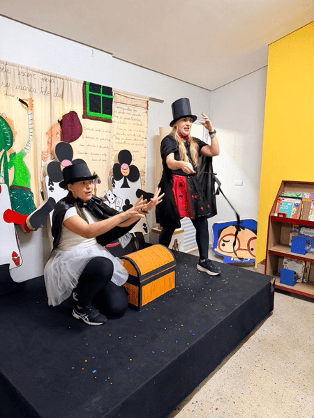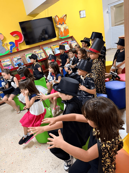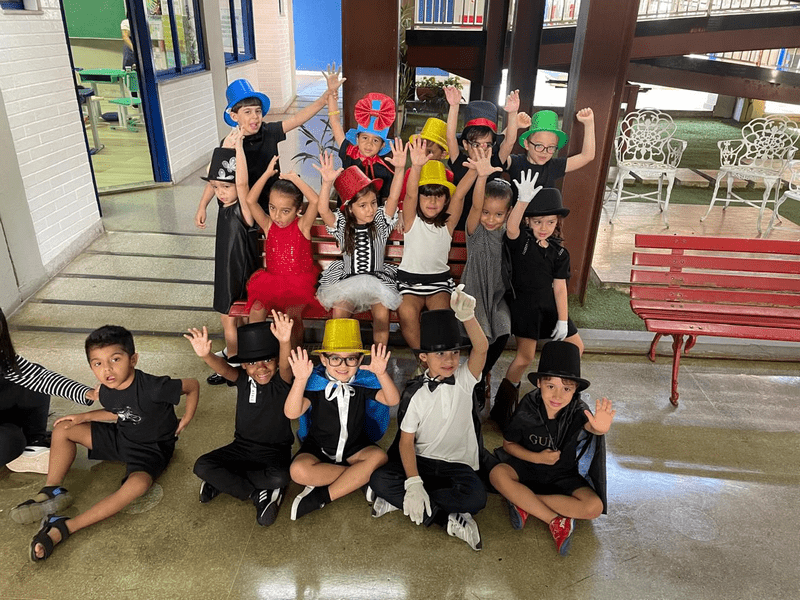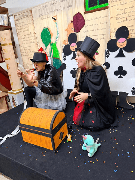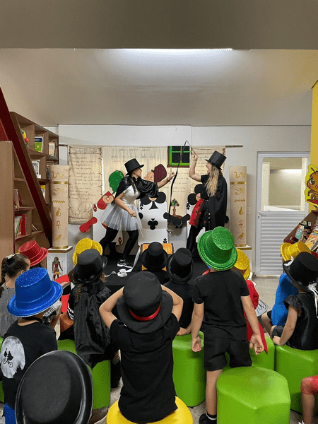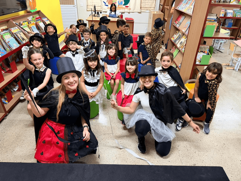 As crianças chegaram caracterizadas, as professoras também, e juntas mergulharam em um universo encantado, onde a imaginação ganhou vida! Em meio a um divertido duelo de mágicos apresentado pelas professoras Elen e Simara, a magia aconteceu… e, como em um passe de mágica, surgiu um presente muito especial: o alfabeto móvel.