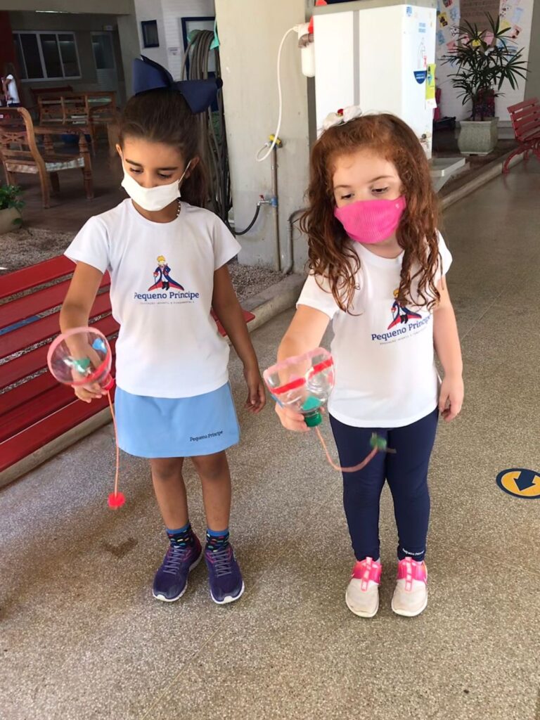 Se não serve, se recicla e de novo vai servir… (Palavra Cantada/ Filipe Edmo). O Infantil 5 da professora Patrícia transformou garrafas em brinquedo, o bilboquê.
